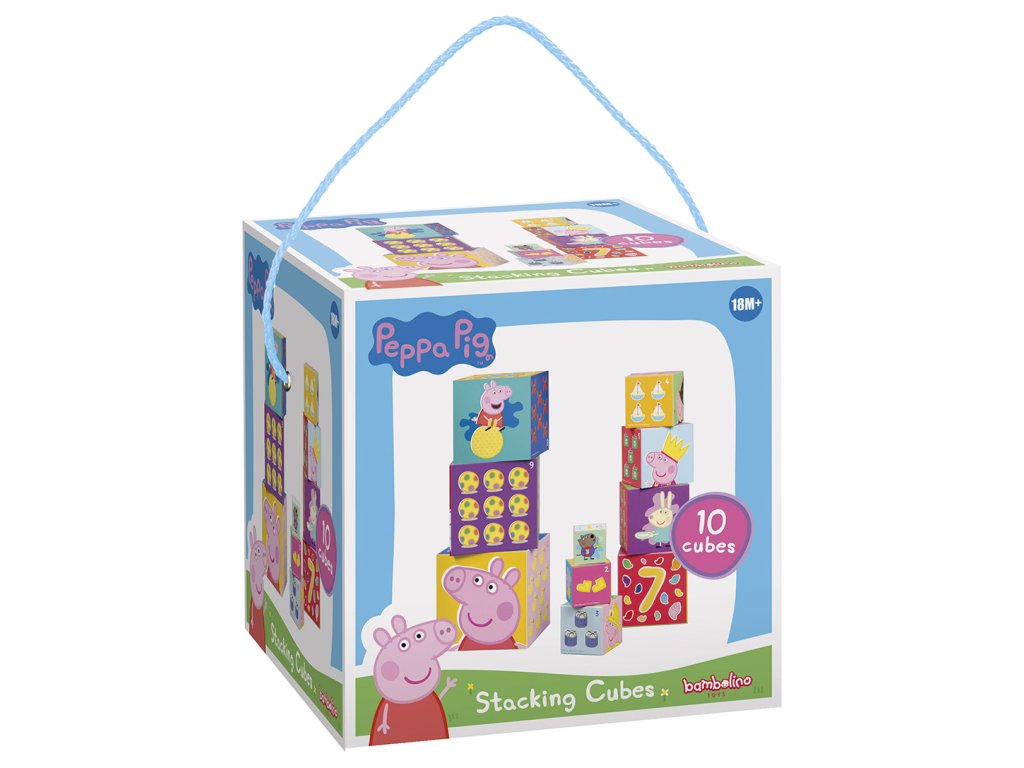 Sada 10 stohovacích kostek s motivy oblíbené postavičky Peppa Pig, ze kterých si děti mohou postavit věž vysokou až 90 cm. Kostky jsou z pevného kartonu a lze je složit do jedné velké kostky.