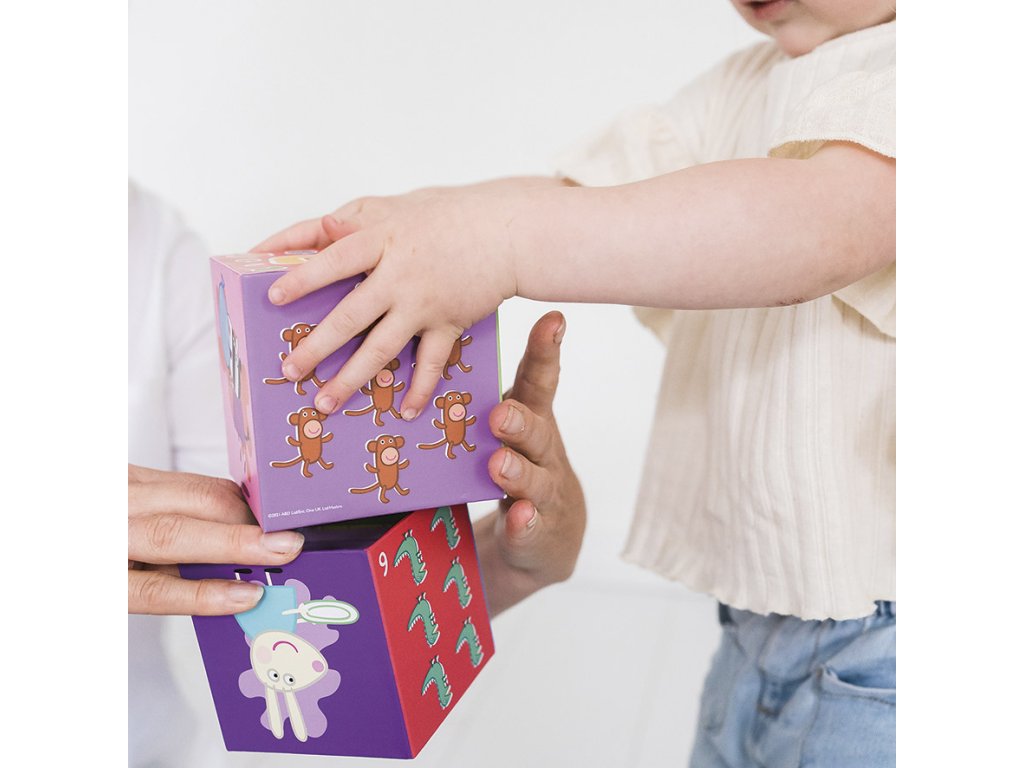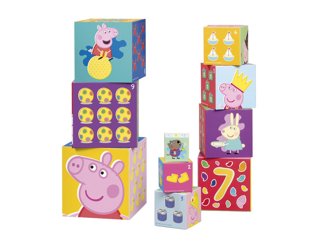 Sada 10 stohovacích kostek s motivy oblíbené postavičky Peppa Pig, ze kterých si děti mohou postavit věž vysokou až 90 cm. Kostky jsou z pevného kartonu a lze je složit do jedné velké kostky.