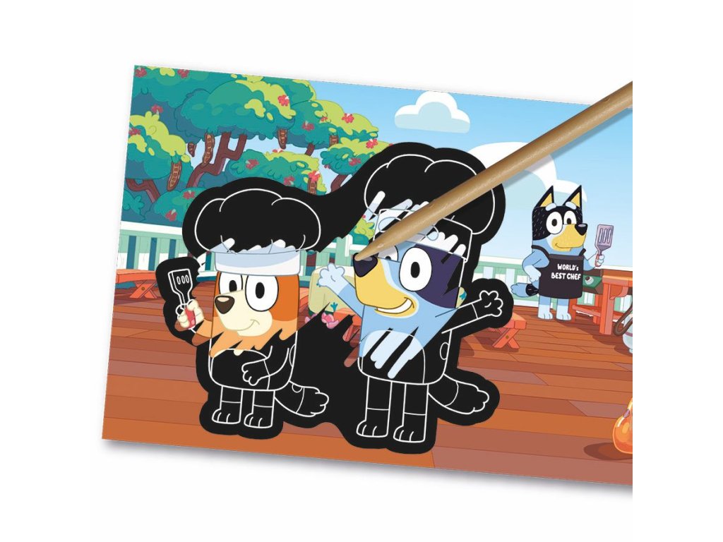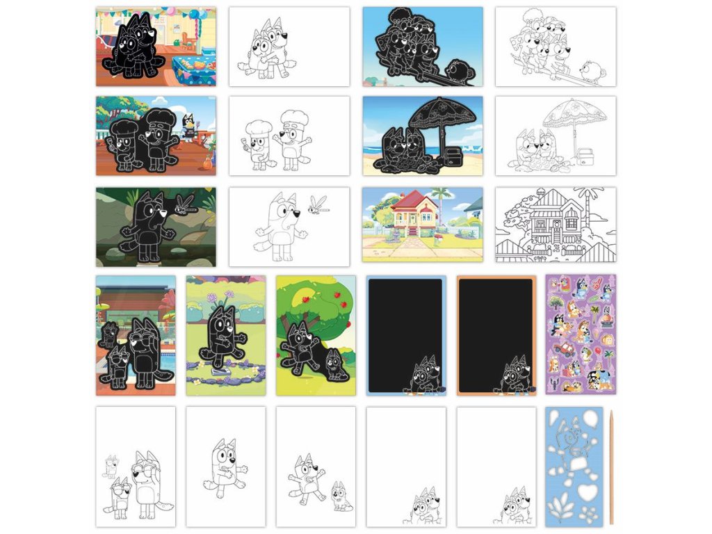 Obsahuje: 10 škrábacích stránek se škrábací tužkou, 11 barevných scén, arch se samolepkami a šablonu.